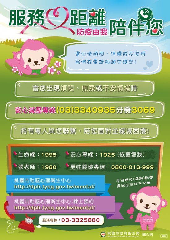 另本市於13區衛生所均有心理諮詢面談駐點服務,有需求之本市民眾均可自行至「桃園市社區心理衛生中心」網站預約或洽03-3325880專人服務。
