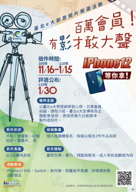 臺北市政府公務人員訓練處(以下簡稱公訓處)舉辦「百萬會員!有影才敢大聲」臺北e大創意短片徵選活動,請同仁踴躍參加