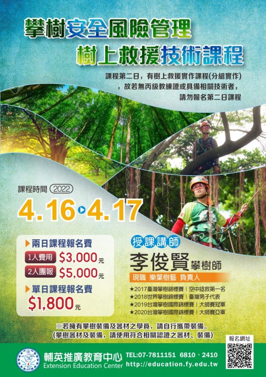 「攀樹安全風險管理-樹上救援技術」認證課程,自即日起開始受理報名,詳細課程內容如招生海報。