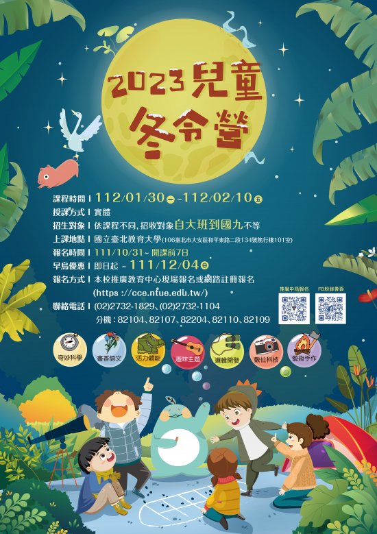 台北教育大學進修推廣處推廣教育中心辦理「2023兒童冬令營」海報及活動課程