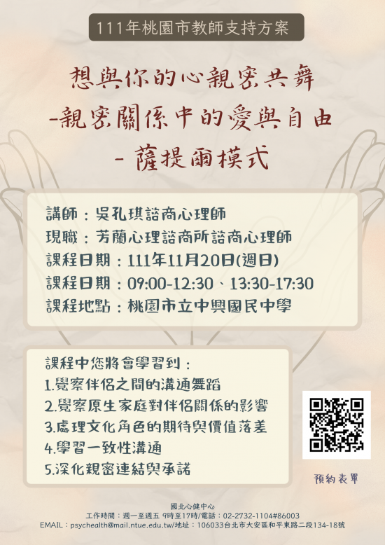 為提供本市教師全面性的服務資源及促進教師與伴侶間的溝通、自我探索,國立臺北教育大學(心理諮商暨健康促進研究中心)規劃實體工作坊1場次。