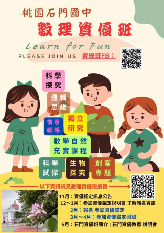 石門國中辦理112學年度資賦優異學生入學前鑑定與資優教育說明會,歡迎有興趣之家長學生報名參加