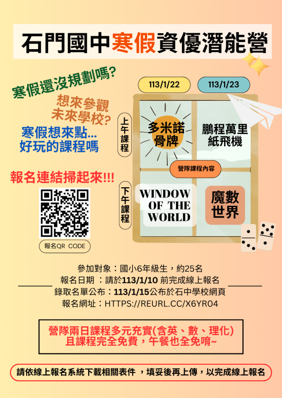 112學年度石門國中寒假資優潛能營,歡迎有興趣之家長學生報名參加