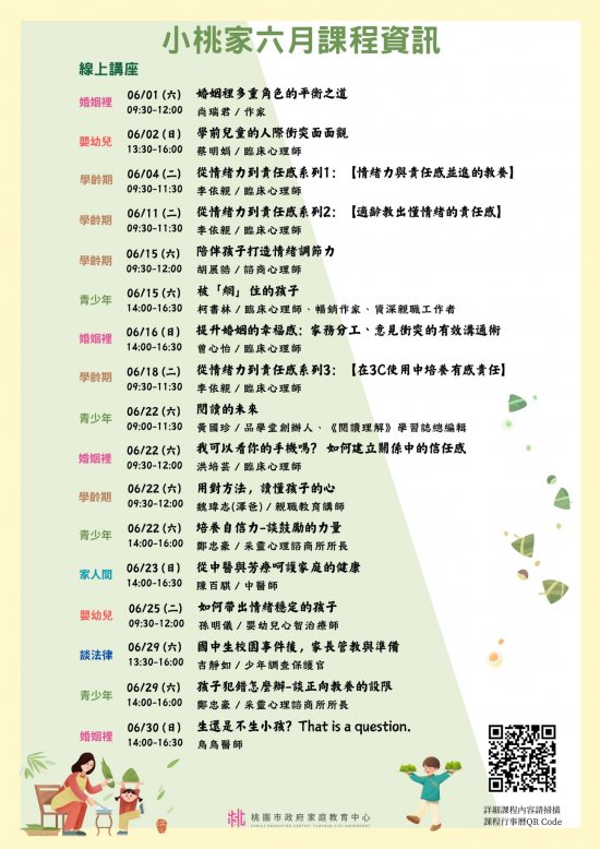 課程詳細資訊,請見中心課程行事曆(https://reurl.cc/xlGyGL)或追蹤「桃園市政府家庭教育中心」FB粉絲專頁;另倘有家庭教育個別化服務需求,可撥打4128185諮詢專線或申請小桃家線上諮詢室(https://reurl.cc/oZWOY5)服務。