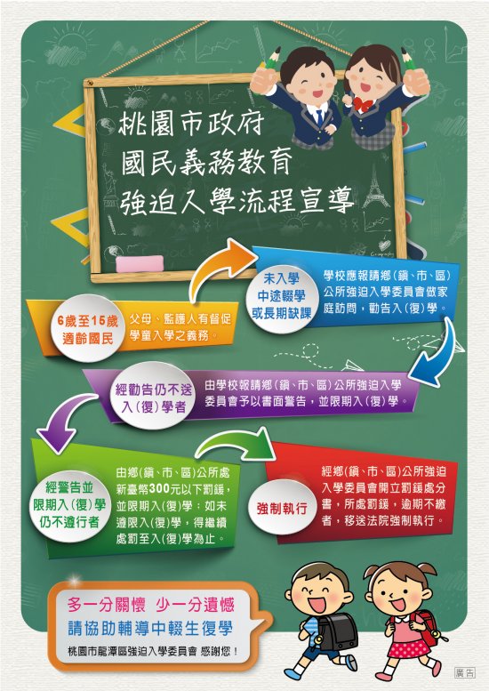 「多一份關愛,多一分瞭解,學習不中輟!」、「多一份關懷,少一份遺憾,教育『零拒絕』,有愛真不『輟』」、「一個都不能少,終結中輟!把孩子找回來!」、「看見希望,看見愛,不要放棄任何一個孩子」