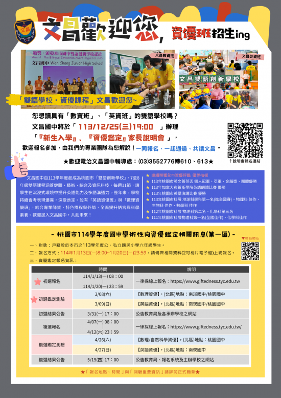 文昌國中辦理114學年度國民中學資賦優異學生鑑定家長說明會及數理資優營隊訊息