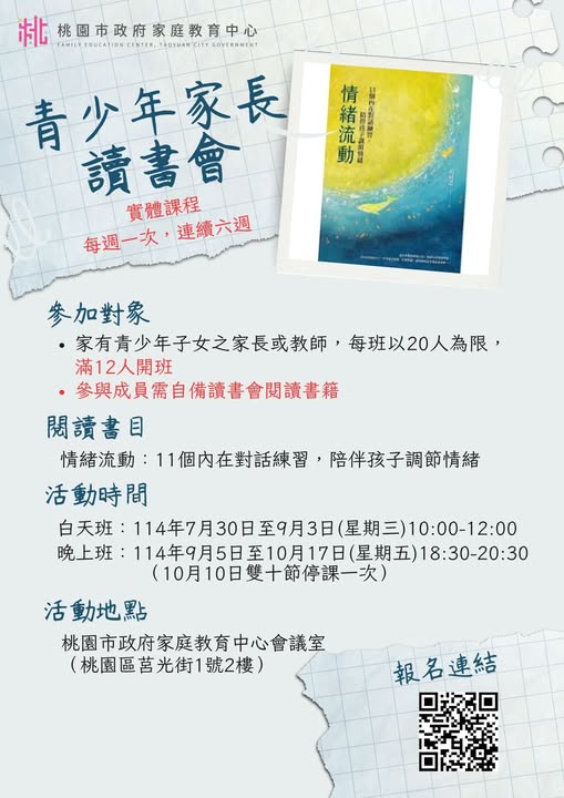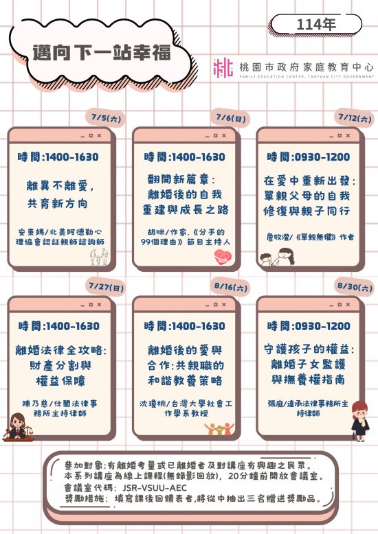 | 二、 | 旨揭課程詳細資訊,請見中心課程行事曆(https://reurl.cc/xlGyGL)或追蹤「桃園市政府家庭教育中心」FB粉絲專頁;另倘有家庭教育個別化服務需求,可撥打4128185家庭教育諮詢專線,本市市民可申請小桃家線上諮詢室(預約連結:https://reurl.cc/oZWOY5),由中心媒合專業人員透過線上會議室提供服務。 |