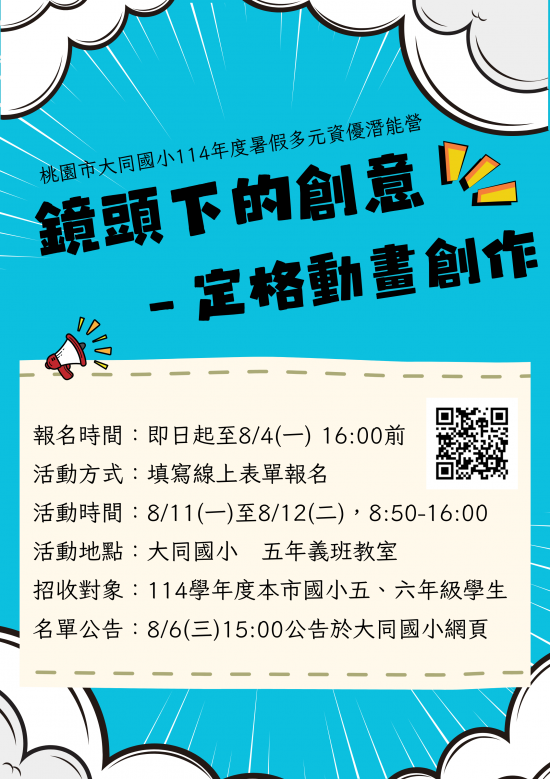 大同國小辦理114年度學生暑假多元資優潛能營活動,敬邀同學踴躍報名參加