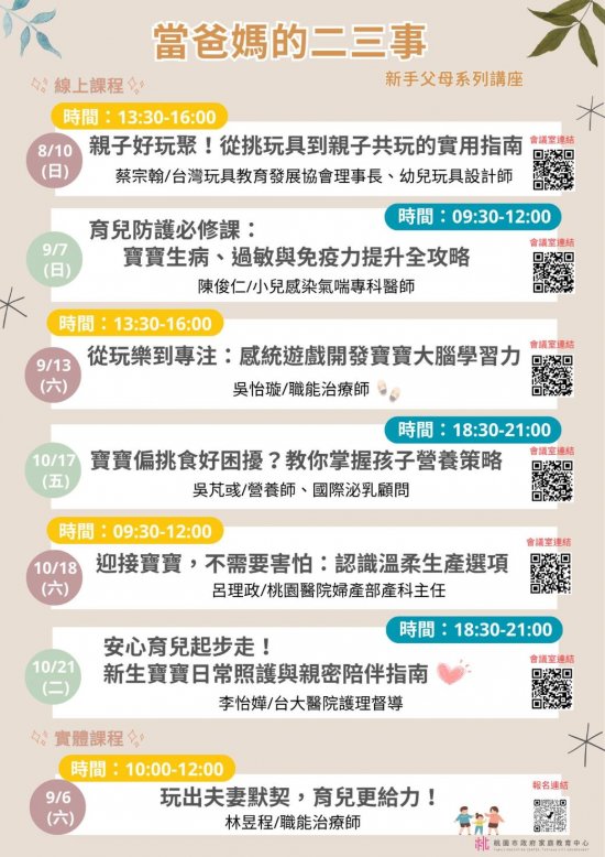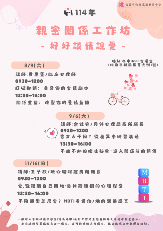 桃園市政府家庭教育中心--「小桃家8月課程資訊」、「當爸媽的二三事」、「親密關係工作坊」