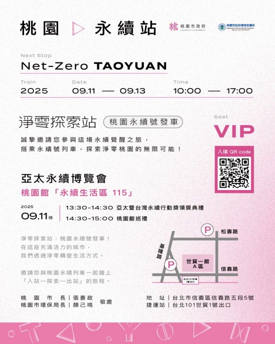 | 三、 | 檢附桃園館電子邀卡(可使用邀卡QR code入場)及亞太永續博覽會參觀報名文宣供參。 |